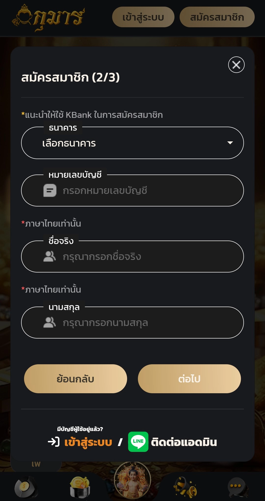 - ชื่อจริง – นามสกุล → ระบุให้ตรงกับบัญชี เพื่อป้องกันปัญหาในการถอนเงิน
